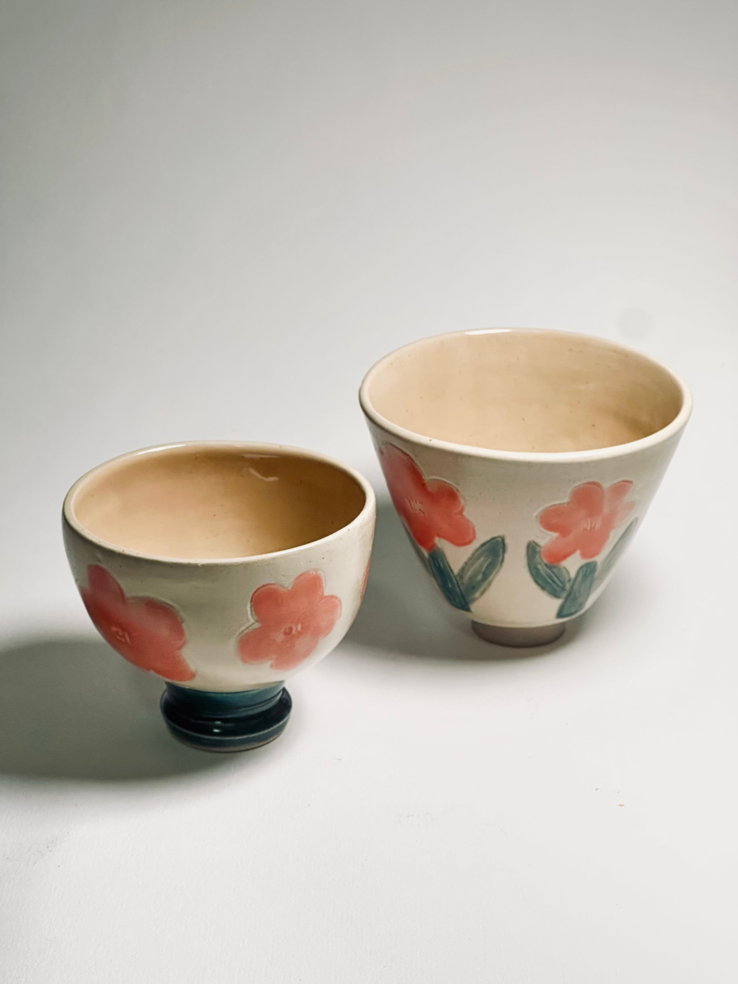 A pair of bowls in two sizes — a footed rice bowl and a larger tea bowl — both decorated with hand-painted pink flowers and green leaves on a cream base. The smaller bowl features a dark blue-green foot. Cheerful, folk-inspired, and perfectly matched for everyday use or display.
